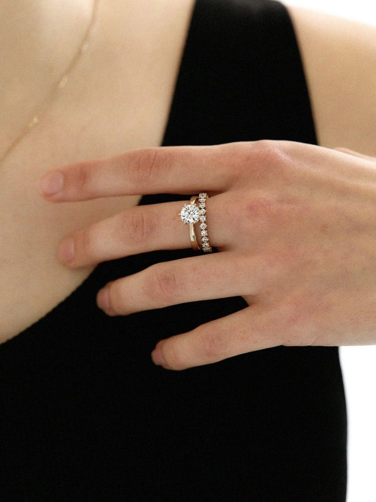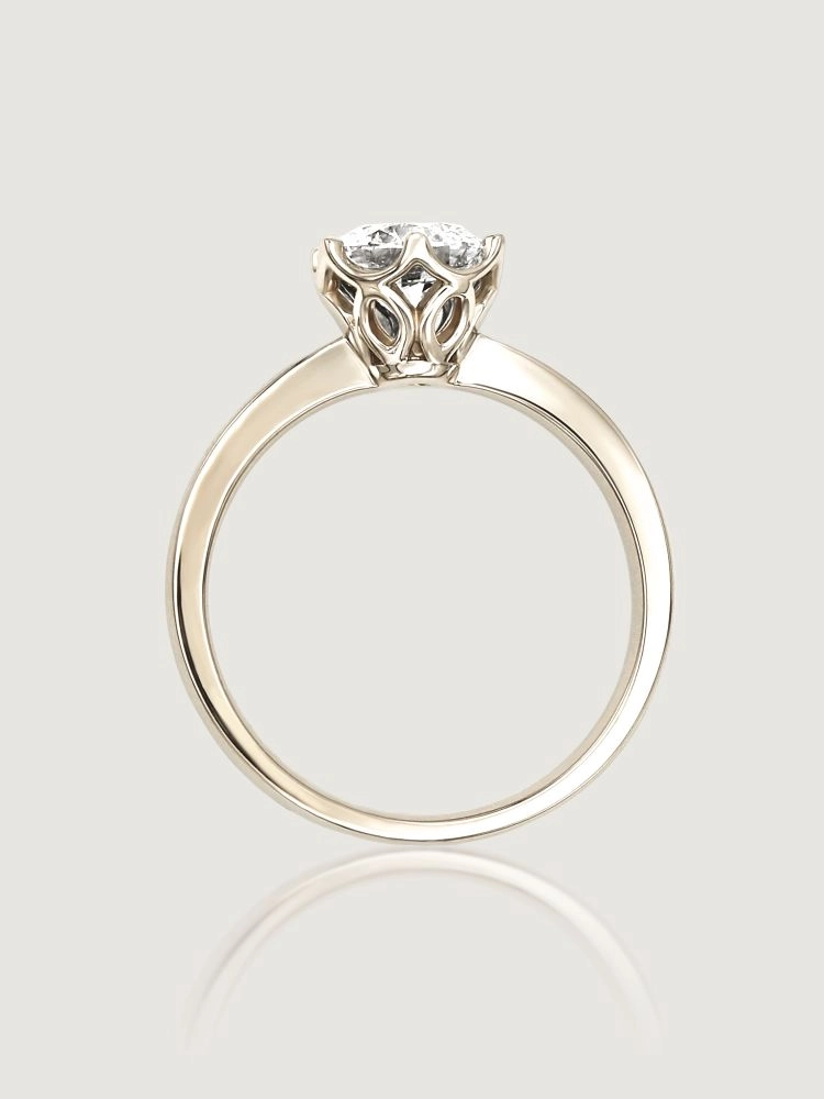 섬세한 옆면 장식은 부드럽고 우아한 분위기를 연출합니다. 일반적인 프롱(발)로 스톤을 고정하는 형태가 아닌, 스톤을 잡아주는 금틀 자체를 크고 두껍게 디자인하여 볼륨감이 느껴지고 견고함을 더해줍니다. 부드럽고 우아한 분위기 속에서 강인함이 느껴지는 디자인입니다.