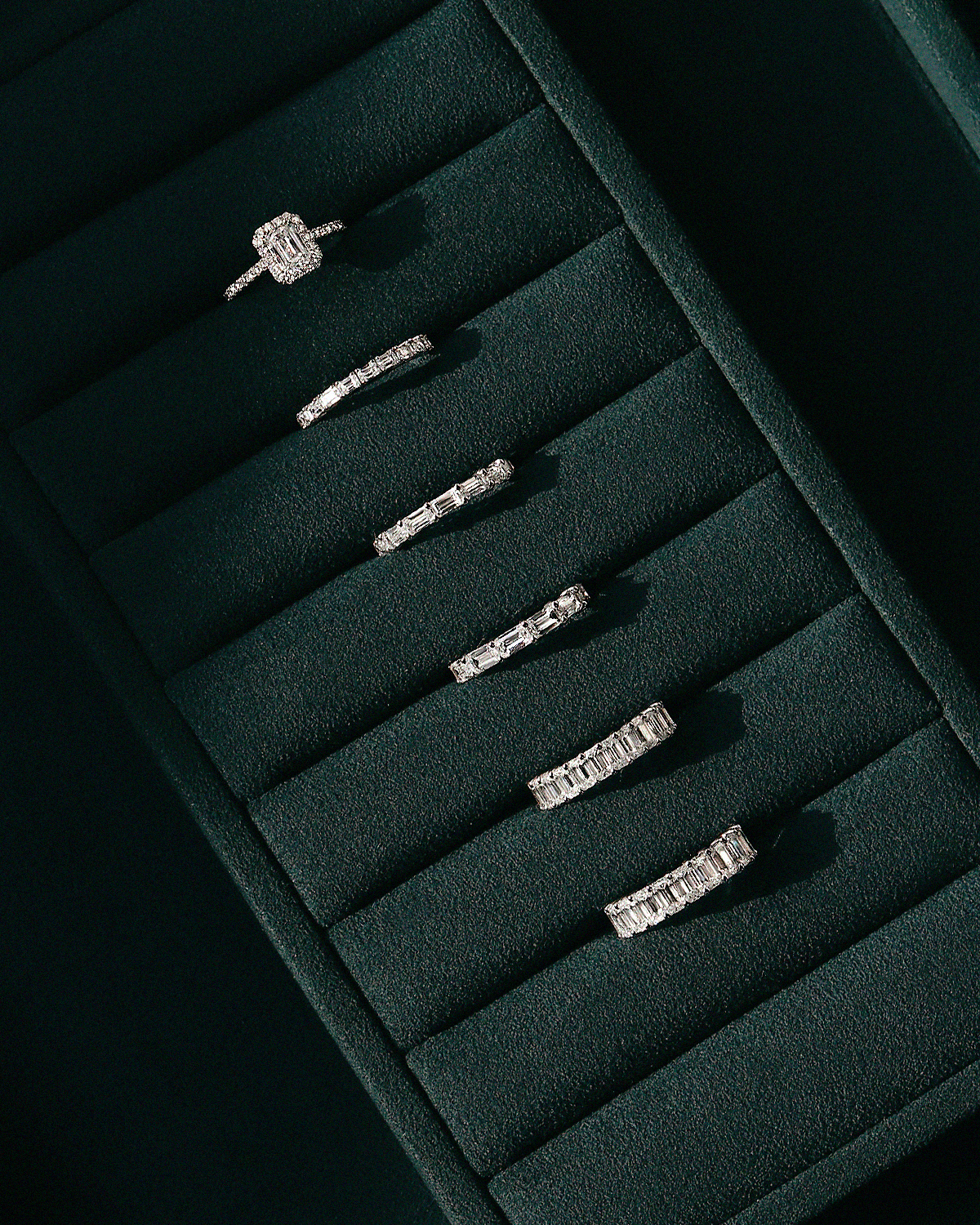 깊고 투명한 호수 조각처럼, 절제된 광채를 지닌 에메랄드 컷이 정교하게 이어진 테니스 스타일의 반지입니다. 직사각형 셰입의 에메랄드 컷이 빈틈없이 촘촘하게 채워져, 세련되고 우아한 분위기가 돋보입니다.