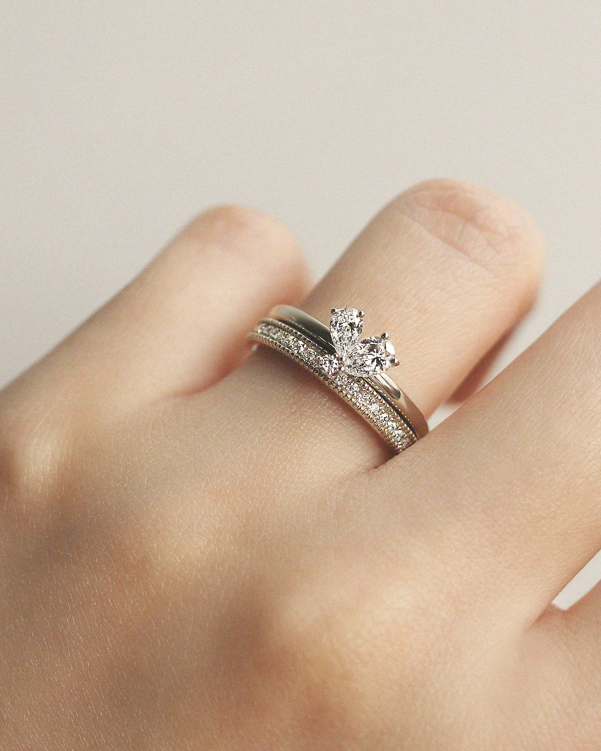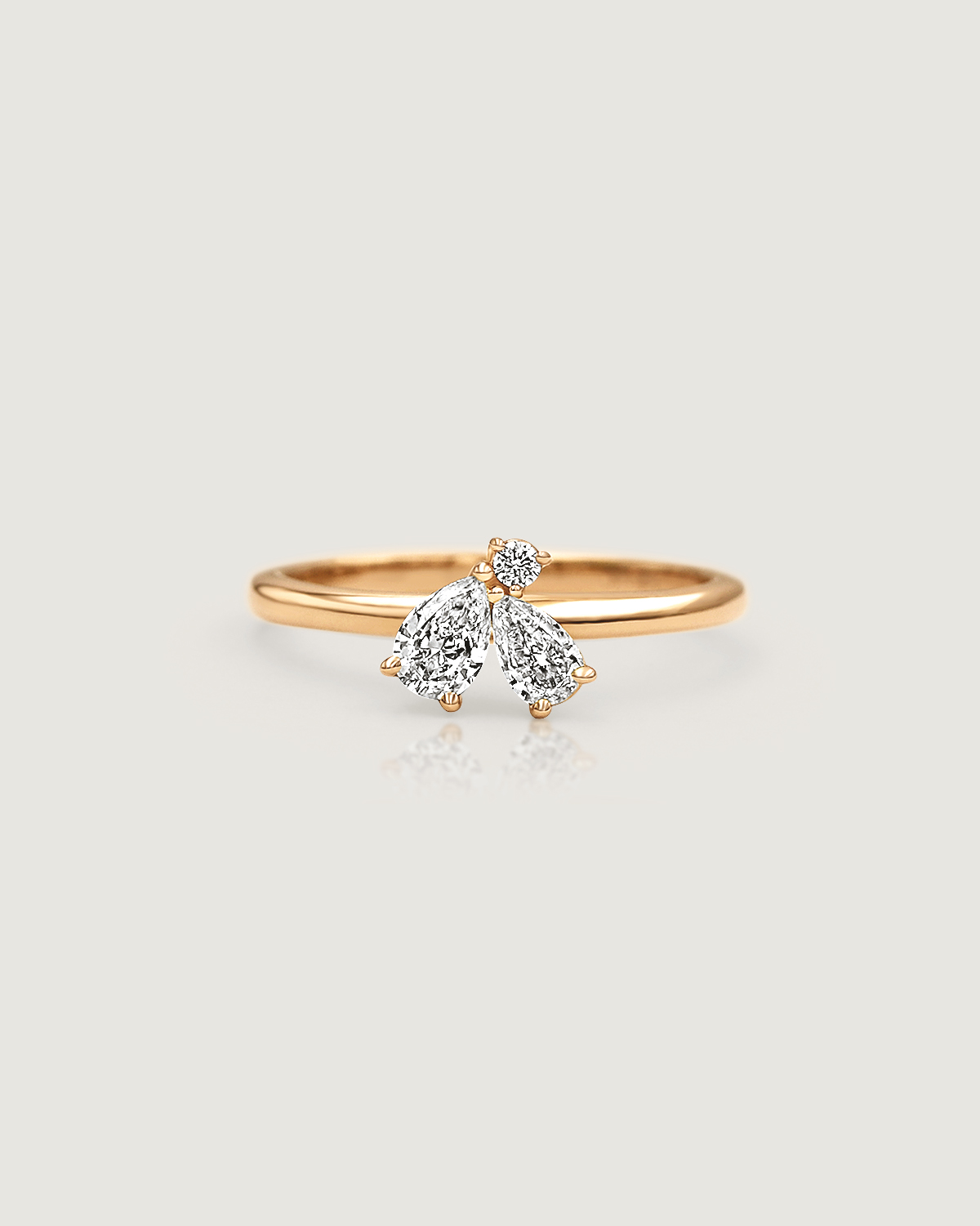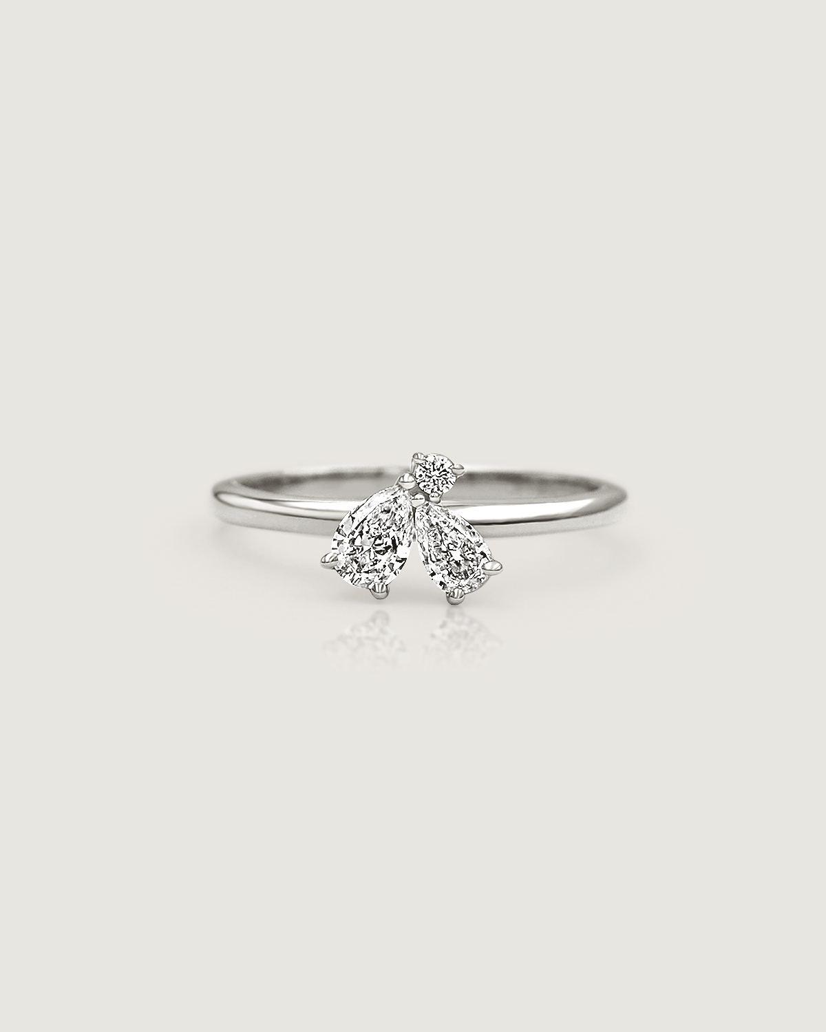 꽃잎을 닮은 섬세한 페어컷 두 피스와 이슬 한 방울이 맺힌 듯 라운드 브릴리언트 컷이 포인트 있게 마무리됩니다.