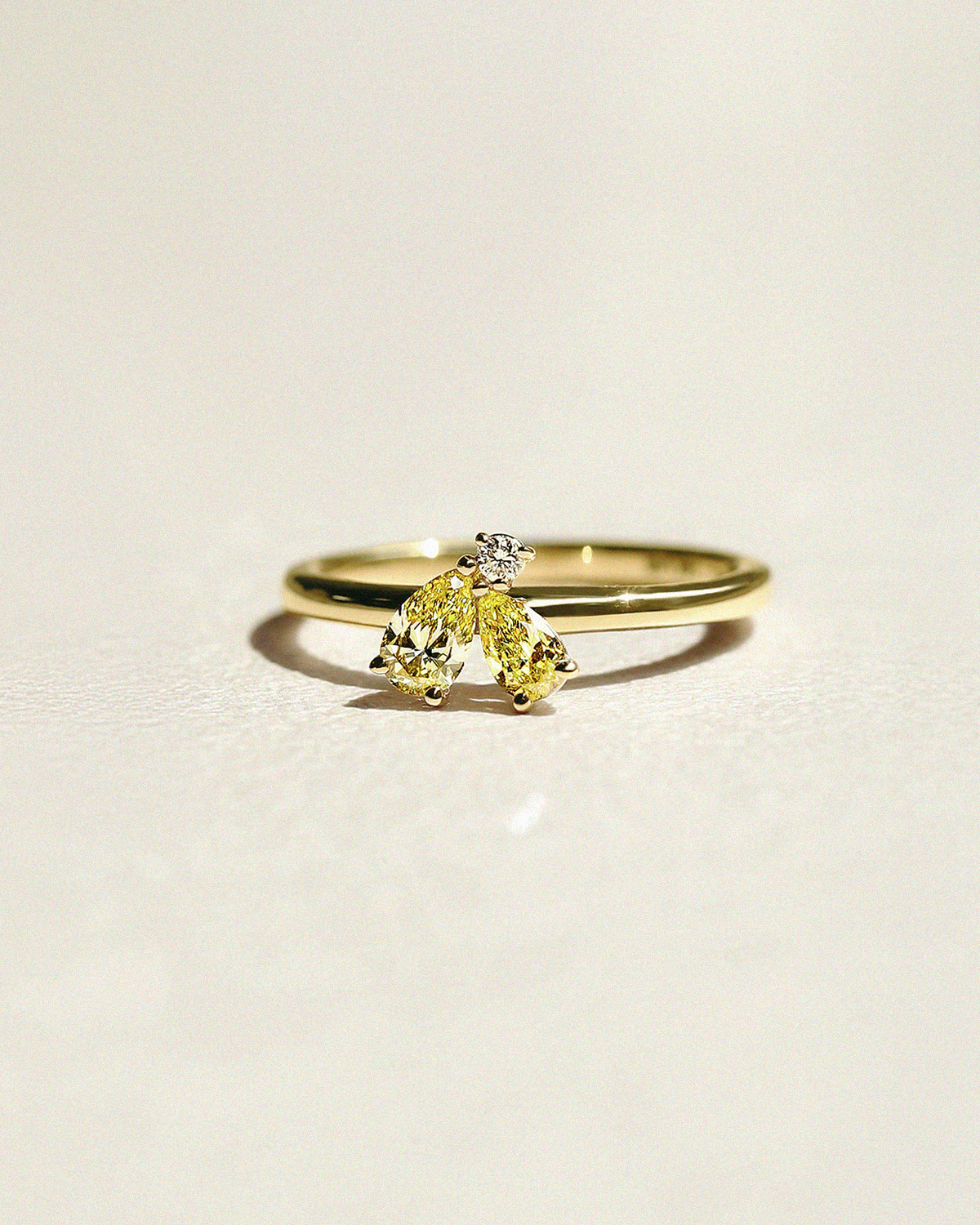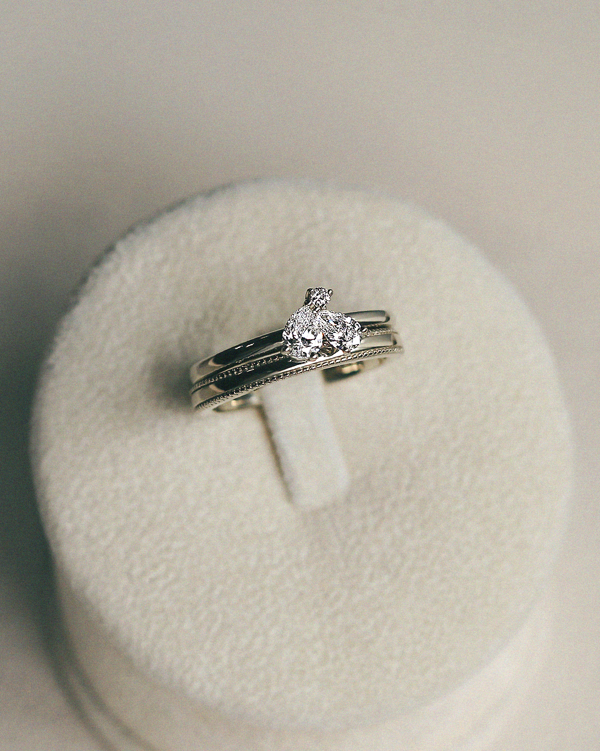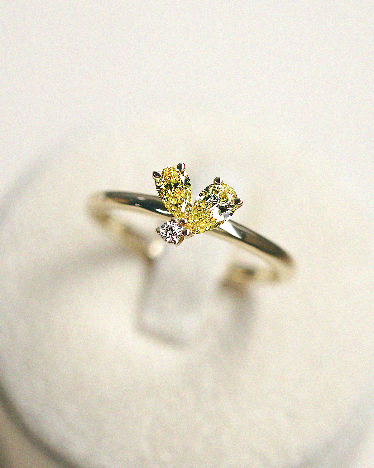 꽃잎을 닮은 섬세한 페어컷 두 피스와 이슬 한 방울이 맺힌 듯 라운드 브릴리언트 컷이 포인트 있게 마무리됩니다.