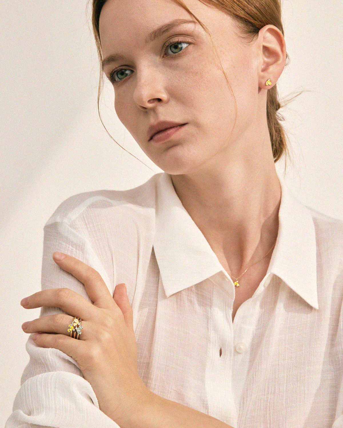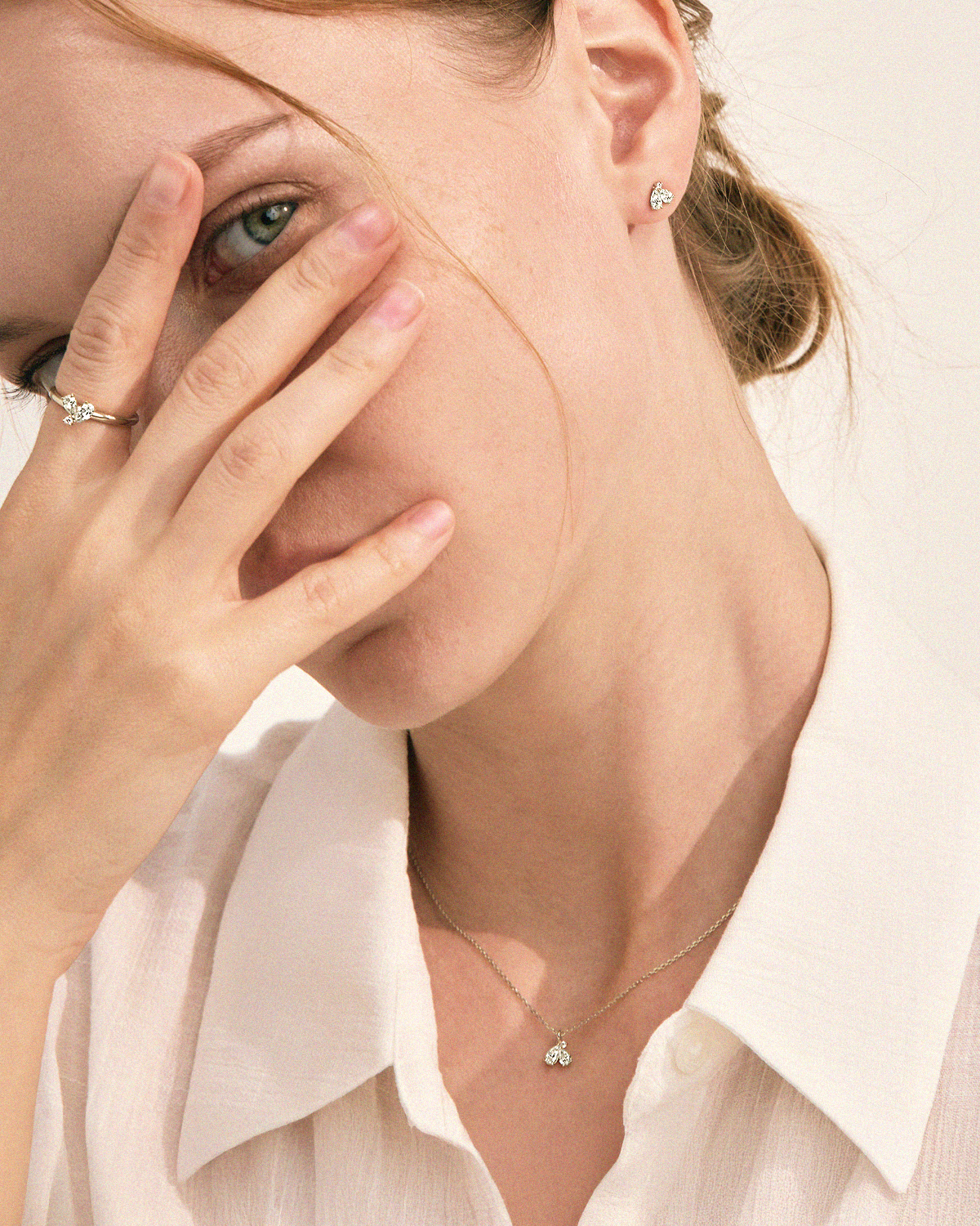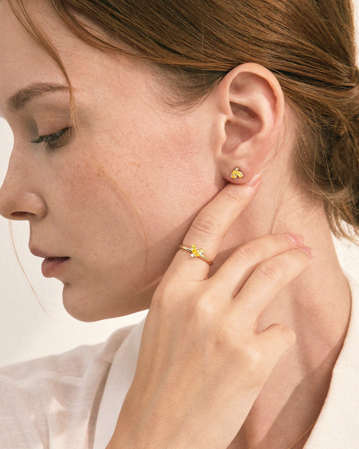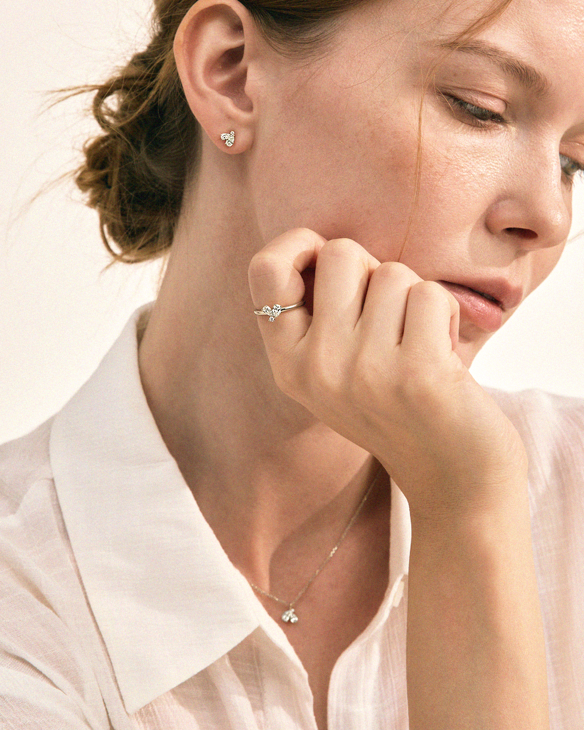 꽃잎을 닮은 섬세한 페어컷 두 피스와 이슬 한 방울이 맺힌 듯 라운드 브릴리언트 컷이 포인트 있게 마무리됩니다.