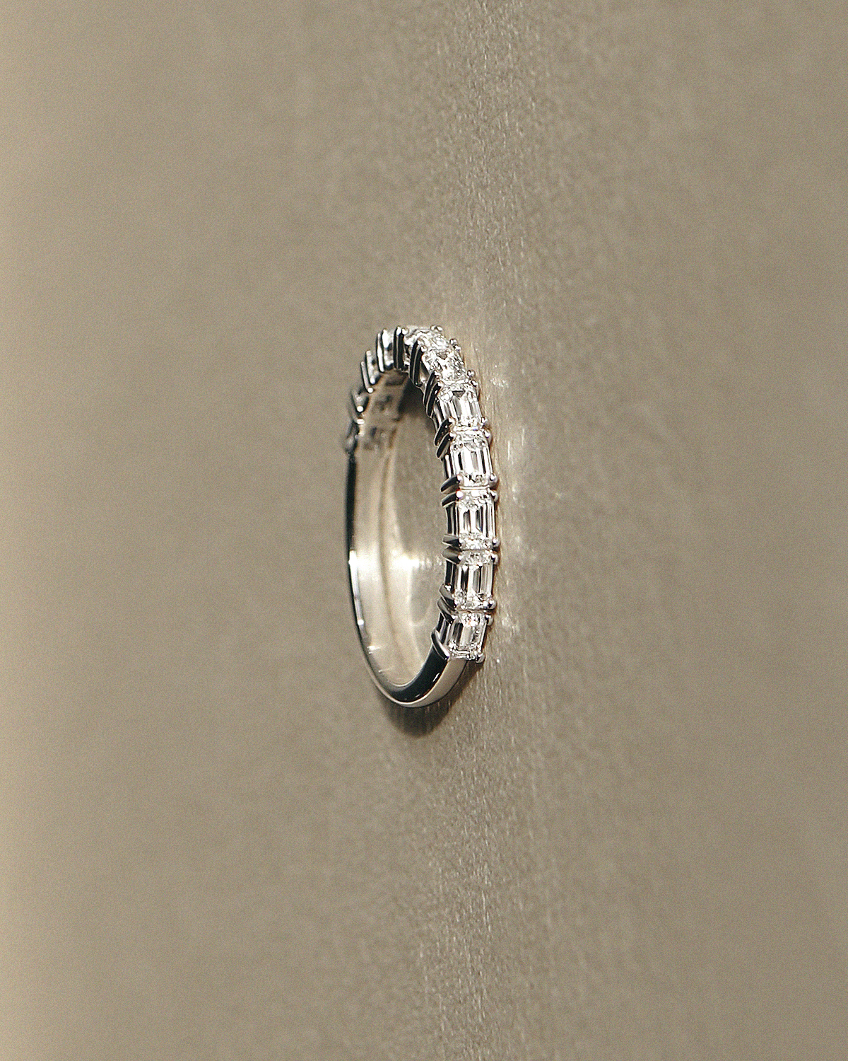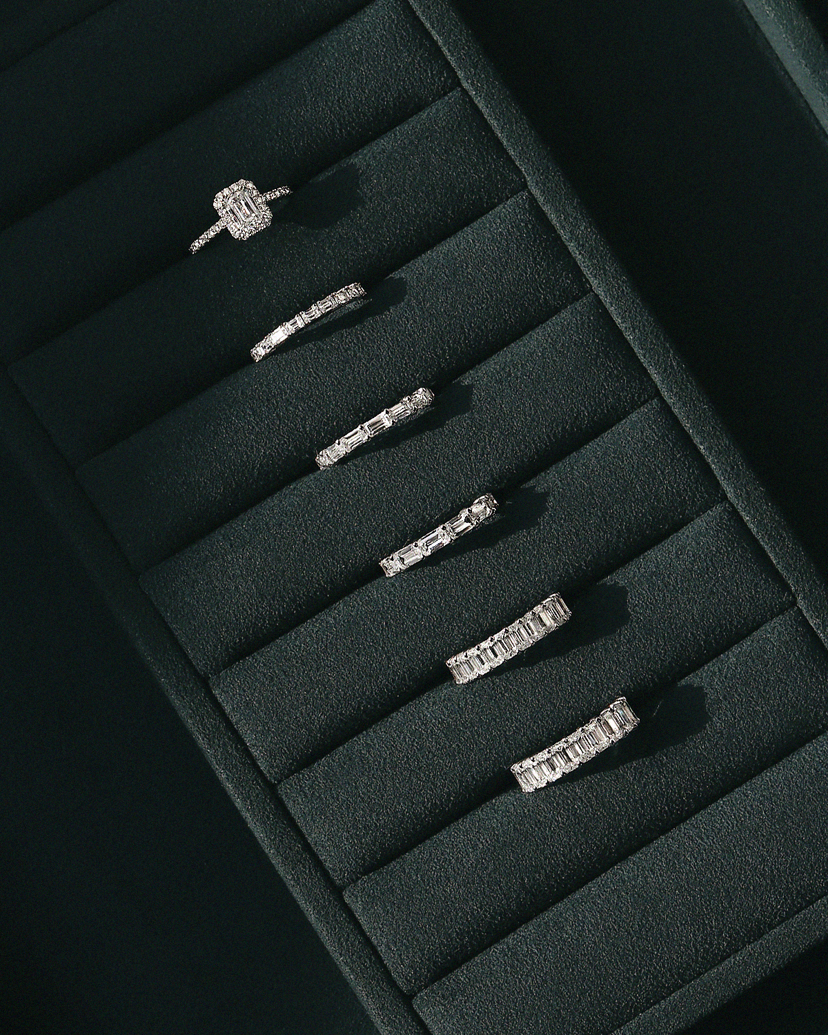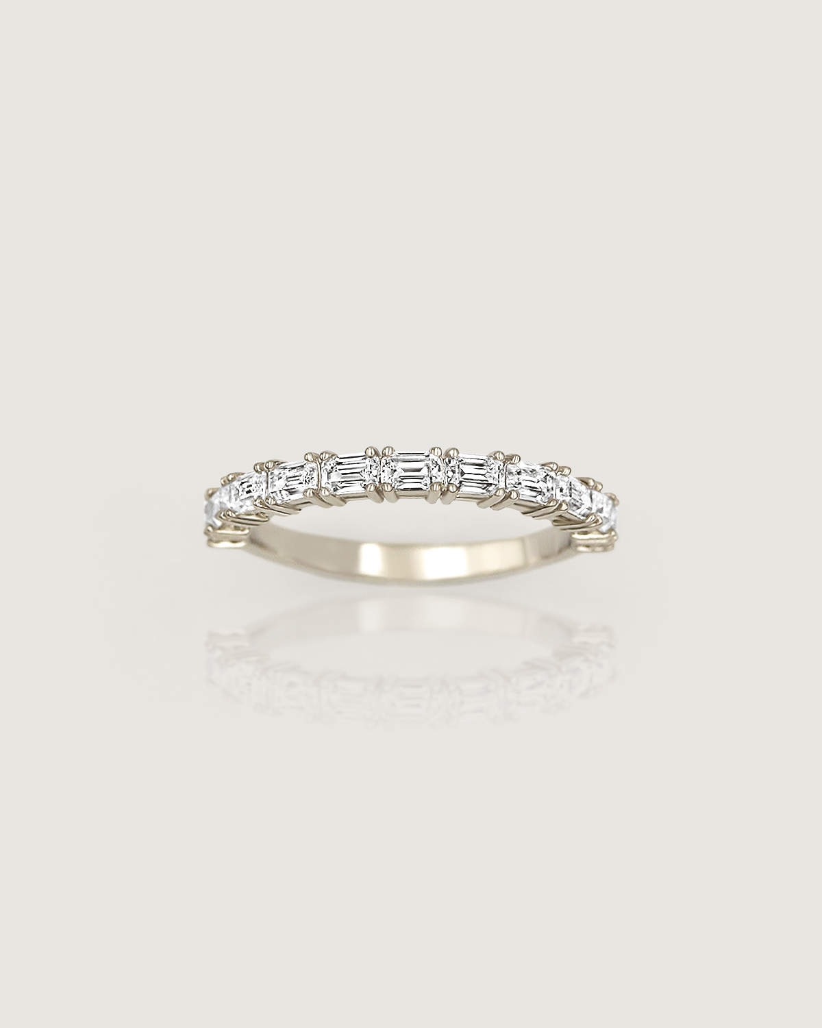 깊고 투명한 호수 조각처럼, 절제된 광채를 지닌 에메랄드 컷이 정교하게 이어진 테니스 스타일의 반지입니다. 직사각형 셰입의 에메랄드 컷이 빈틈없이 촘촘하게 채워져, 세련되고 우아한 분위기가 돋보입니다.