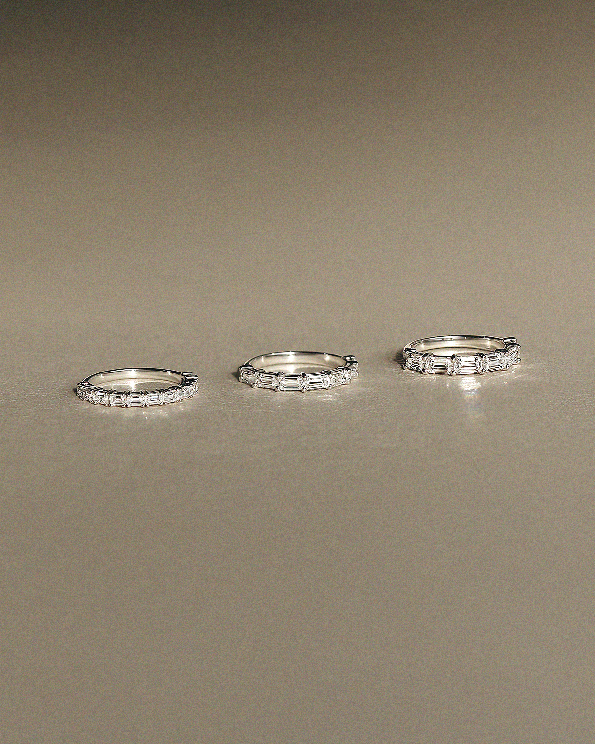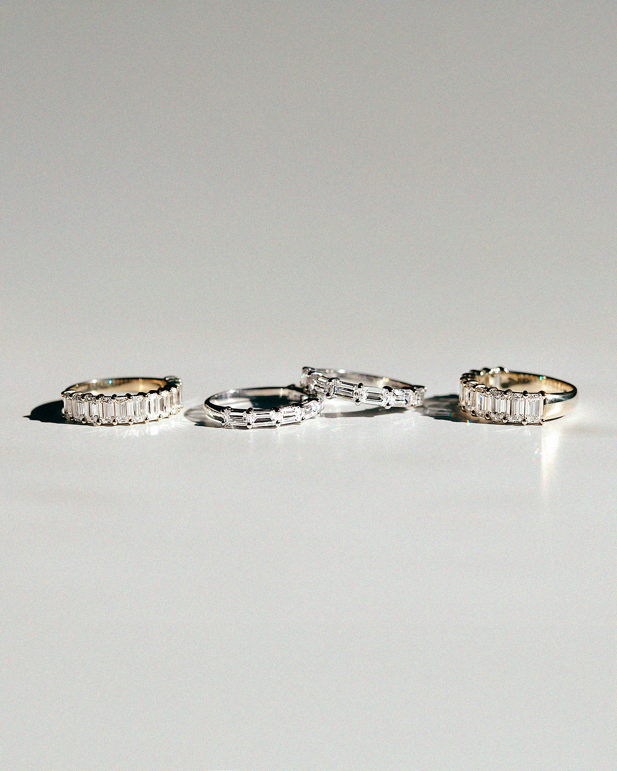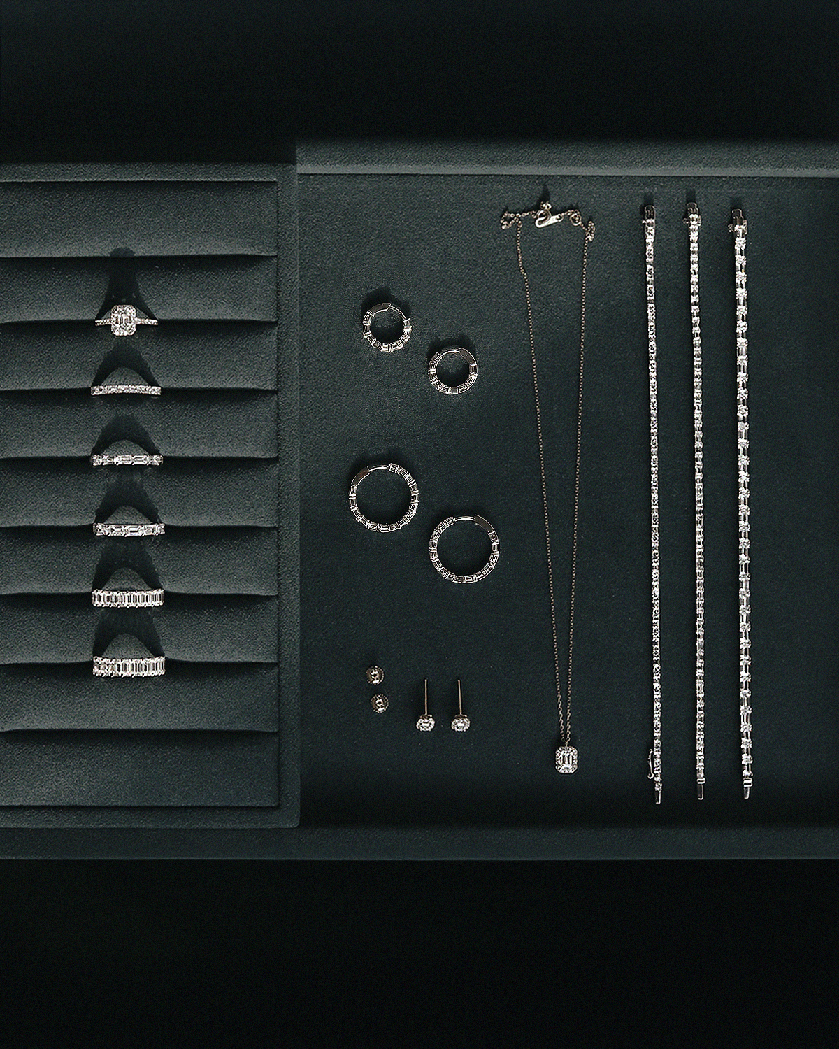 깊고 투명한 호수 조각처럼, 절제된 광채를 지닌 에메랄드 컷이 정교하게 이어진 테니스 스타일의 반지입니다. 직사각형 셰입의 에메랄드 컷이 빈틈없이 촘촘하게 채워져, 세련되고 우아한 분위기가 돋보입니다.