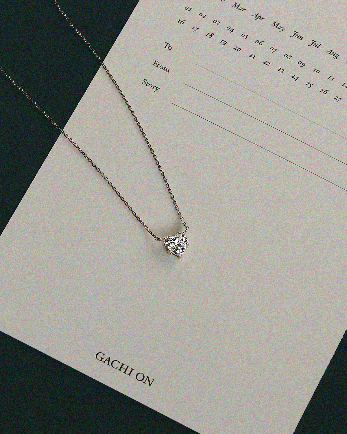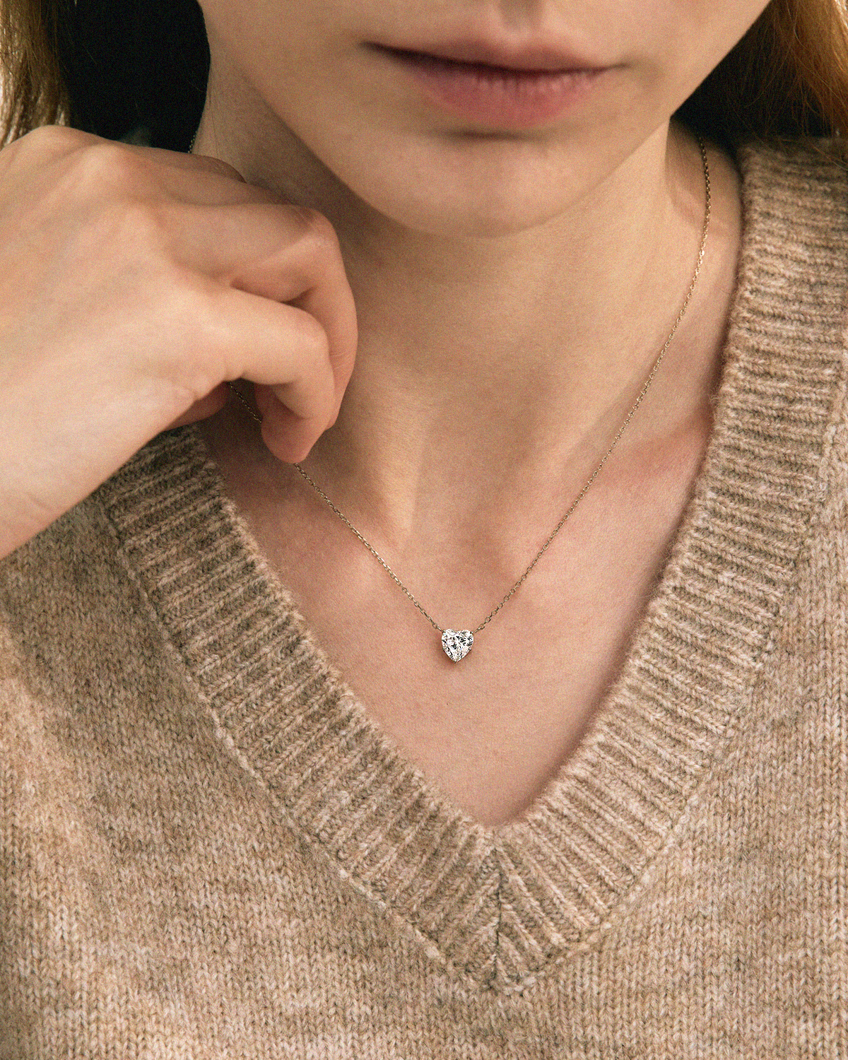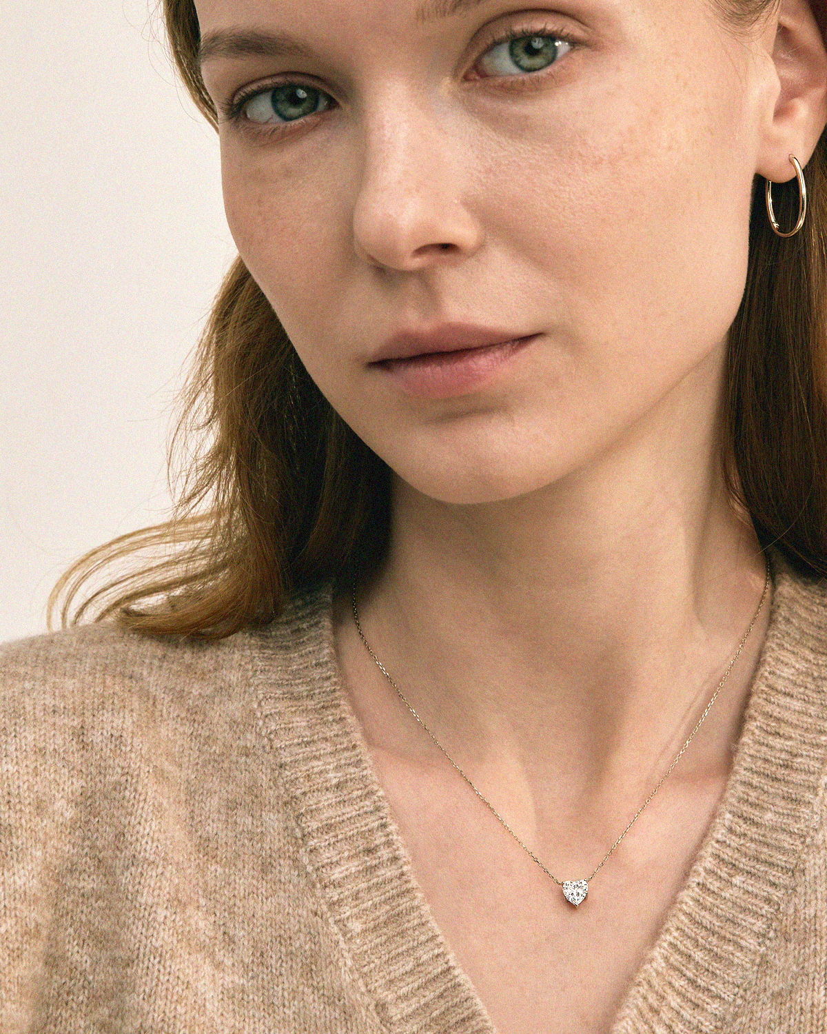 쇄골 사이에 놓인 하트 셰입은 움직임에 따라 선명한 빛을 드러내며, 페미닌하면서도 로맨틱한 분위기를 자연스럽게 완성합니다.