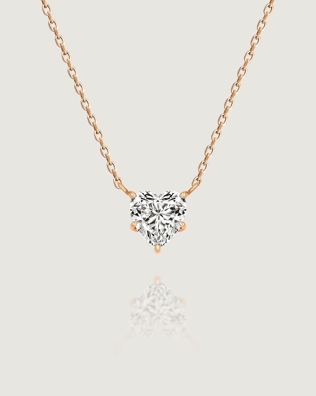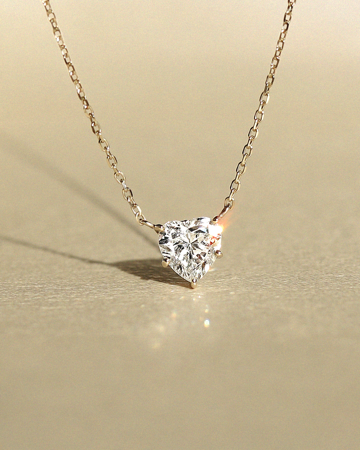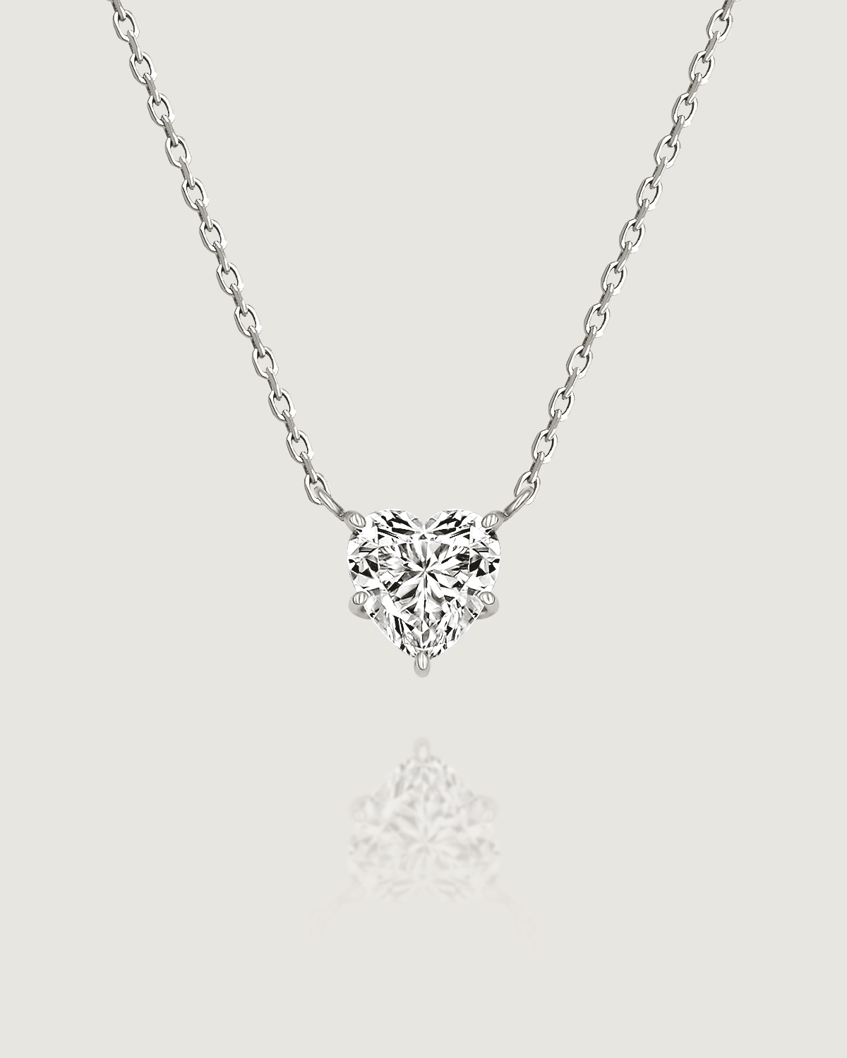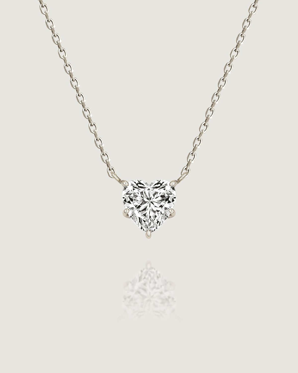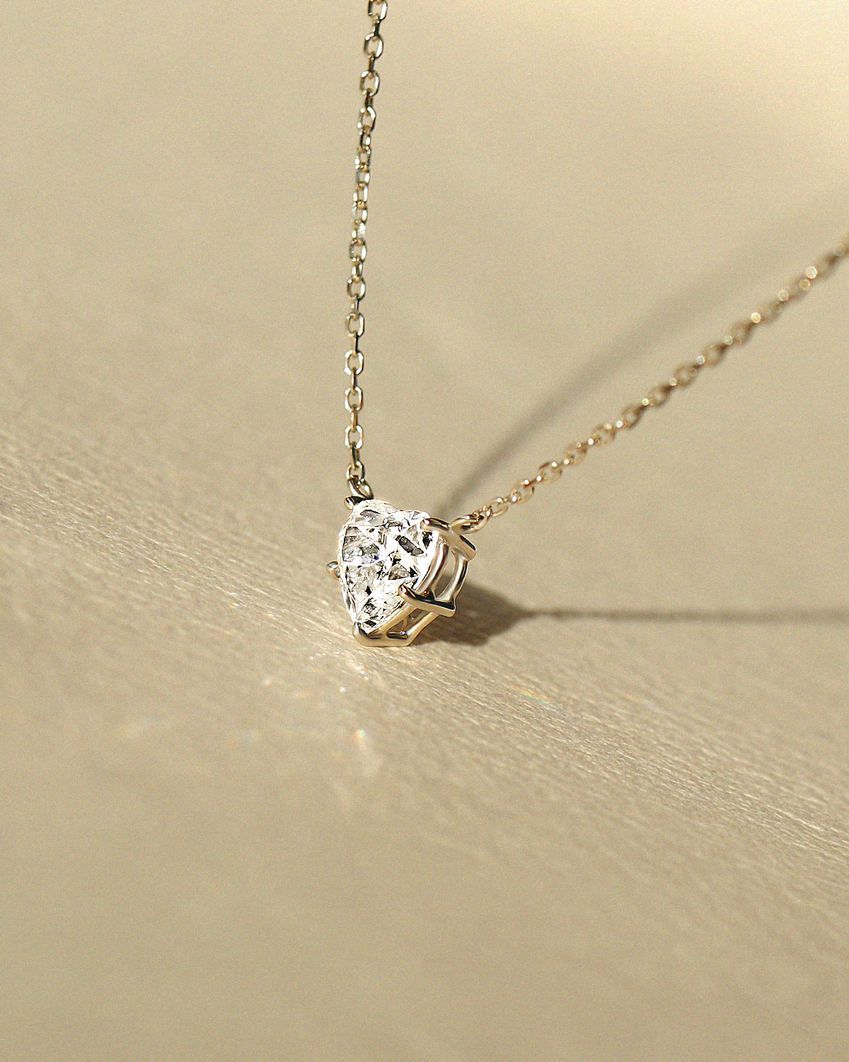 Single Heart Necklace는 1캐럿 하트 컷 스톤을 5개의 프롱으로 섬세하게 세팅하여, 스톤이 공중에 떠 있는 듯한 투명한 공간감을 완성합니다. 절제된 구조 속에서 시선은 자연스럽게 스톤에 머물며, 깊고 단단한 존재감을 드러냅니다.