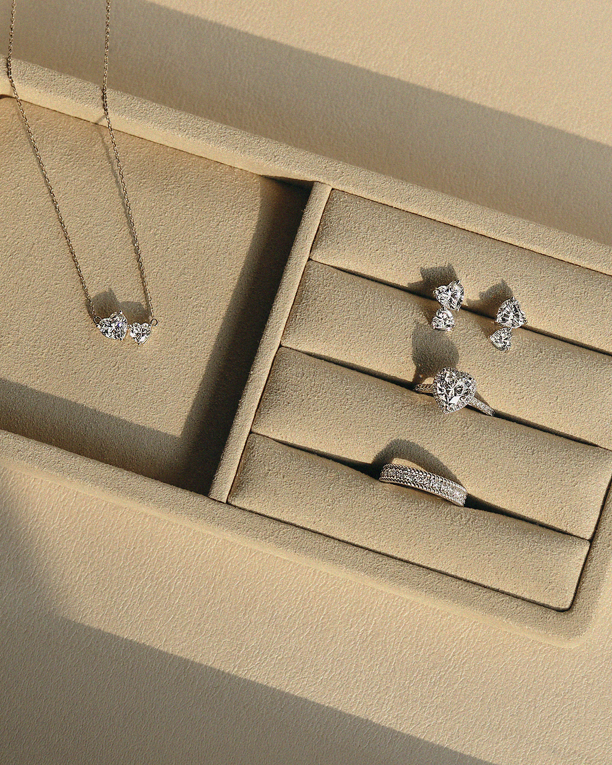 사랑의 본질을 가장 순수한 형태로 담아낸 At Heart 컬렉션 안에서, 서로 다른 두 개의 하트가 마주하는 Double Heart Necklace와 Earring입니다.