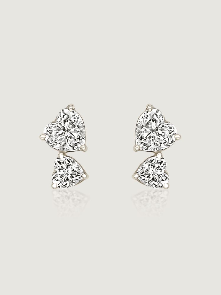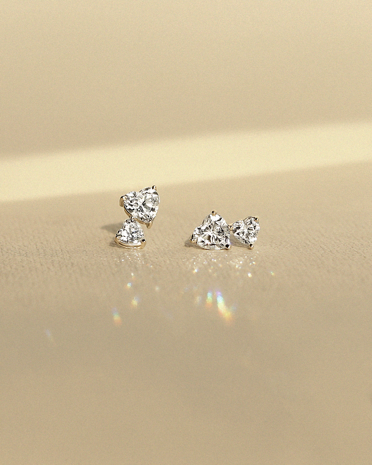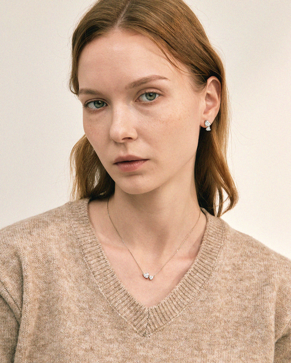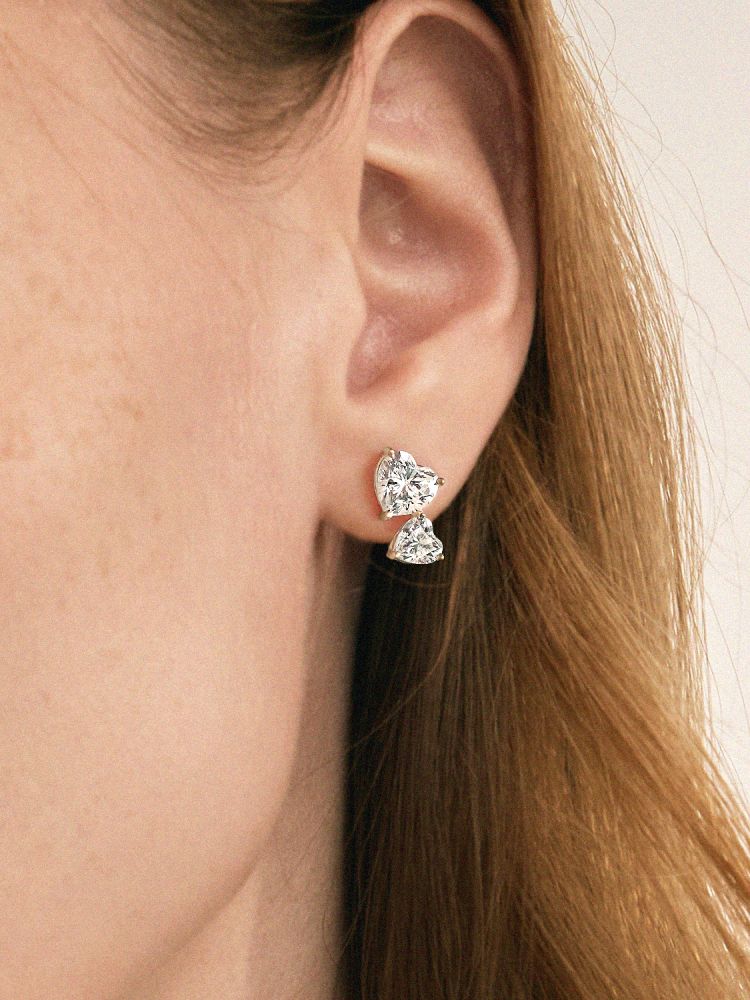 1캐럿과 약 0.4~0.5캐럿의 하트 컷 스톤이 감정이 흐르듯 부드럽게 이어지며, 서로를 향해 기울어진 균형 속에서 아름다운 형태를 완성합니다. 페미닌하면서도 우아하고 로맨틱한 분위기를 자연스럽게 자아냅니다.